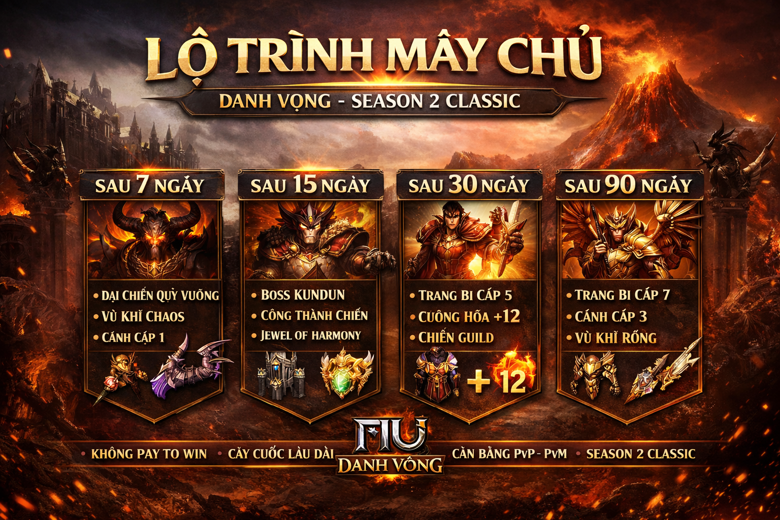 🔥 Danh Vọng được thiết kế theo lộ trình phát triển chậm – ổn định – lâu dài, mang lại trải nghiệm MU Season 2 Classic đúng nghĩa cho cộng đồng game thủ.